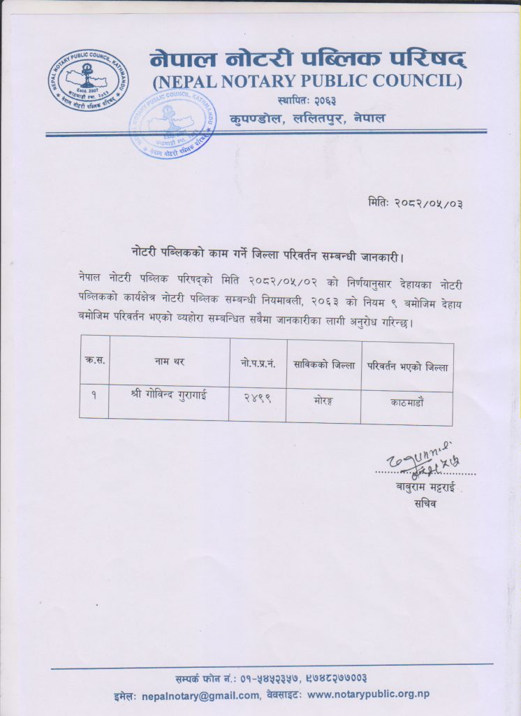 नोटरी पब्लिकको काम गर्ने जिल्ला परिवर्तन सम्बन्धी जानकारी।